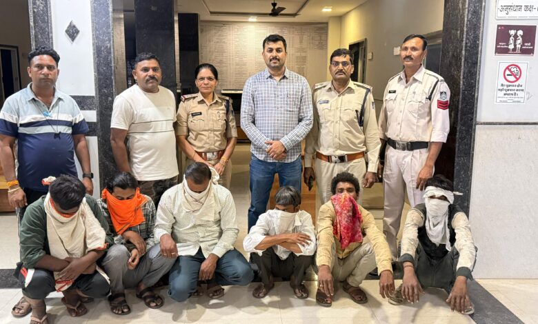 बुरहानपुर। श्रीमान पुलिस अधीक्षक महोदय श्री देवेन्द्र पाटीदार व्दारा क्षेत्र में अवैध जुआ-सट्टा पर प्रभावी कार्यवाही करने हेतु निर्देशित किया गया था जिसके पालन अति. पुलिस अधीक्षक महोदय श्री अंतरसिंह कनेश एवं अनुविभागीय अधिकारी (पुलिस) नेपानगर श्री निर्भयसिंह अलावा के मार्गदर्शन में दिनांक 25/04/2025 को रात्री में थाना प्रभारी अभिषेक जाधव को मुखबिर सूचना प्राप्त हुई की ग्राम जामनिया रोड तरफ कलाली के पीछे खेत में में कुछ व्यक्ति पत्तो से हार जीत का जुआ खेल रहे है। सूचना पर विश्वास कर हमराह फोर्स के ग्राम बताये स्थान में टीम बनाकर रवाना किया गया । कलाली के पीछे खेत में 06 व्यक्ति जुआ खेलते दिखे जिन्हे फोर्स की मदद से घेराबन्दी कर पकडा गया । जिनका नाम पता पुछते 1. विजेश पिता मोजीलाल मावस्कर जाति कोरकू उम्र 24 साल निवासी ग्राम रगई, 2. विरेन्द्र पिता भारत सुर्यवंशी उम्र 30 साल निवासी खकनार कला, 3. उमेश पिता प्रकाश जाधव उम्र 35 साल निवासी खकनार कला, 4. गोपाल पिता हरीचन्द ढोले उम्र 32 साल निवासी खकनार खुर्द, 5. अतुल पिता सुभाष पाटील उम्र 40 साल निवासी खकनार कला, 6. सुनिल पिता भुरा महाजन उम्र 50 साल निवासी खकनार कला का होना बताया । मौके पर आरोपियो के कब्जे एवं फड़ से 52 ताश पत्ते व नगदी 38,400/- रूपये जप्त किये गये । वापसी पर आरोपियो के विरूद्ध अपराध पंजीबद्ध कर विवेचना में लिया गया ।