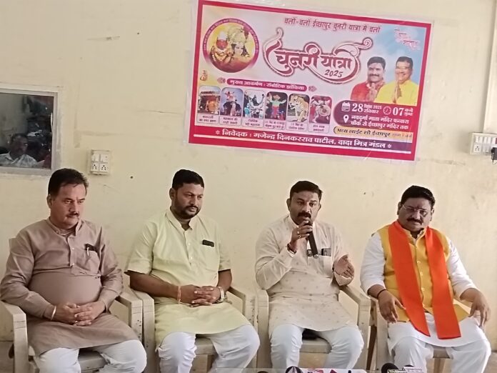 चुनरी यात्रा के प्रभारी व पूर्व महापौर श्री अनिल भोसले ने कहा की वर्ष 2016 में एक युवा के मन में विचार आया कि शारदीय नवरात्र में एक चुनरी यात्रा निकाली जाए ताकि आने वाली पीढ़ी को सनातन धर्म से जोड़कर रखा जा सके। इस उद्देश्य से भाजपा युवा नेता गजेंद्र पाटील ने चुनरी यात्रा की शुरुआत की जो आज भव्य स्वरूप ले चुकी हैं । माँ इच्छादेवी सभी की मनोकामना पूर्ण करती है मेरा जिलेवासियों से अनुरोध है कि परिवार सहित इस ऐतिहासिक चुनरी यात्रा में सम्मिलित रहे। प्रेस वार्ता में जिला पंचायत सदस्य श्री अनिल राठौर, भाजपा के वरिष्ठ नेता श्री मनोज टंडन आदि मौजूद रहे।